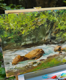 Wir malen 1–2 Motive pro Tag, z. B. Wildbach, Alm, Wiese oder